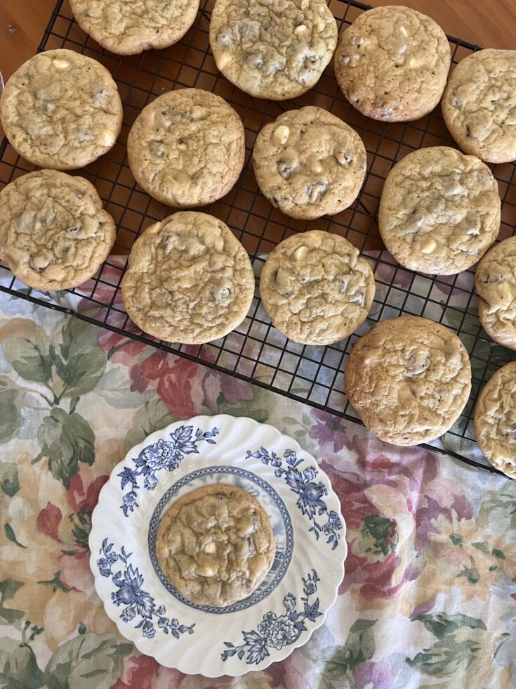 Bake at 325 degrees Farenheight for around 18 minutes (small) or 25 minutes (large) until just golden brown around the edges. You want them to seem slightly underdone on the inside but set up on the outside, so you may need to slightly adjust the baking time one way or another for this. This is how they stay soft. If you want crispier cookies, bake a little longer. Allow the baked cookies to cool on the baking sheet or wire rack.