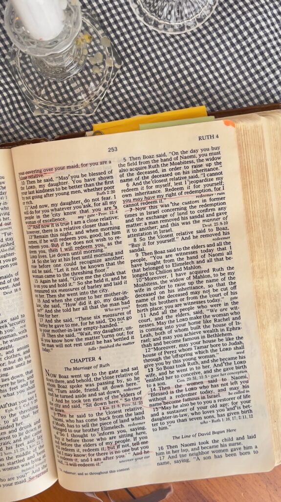 ultimate plan being fulfilled in the book of Ruth through the love story of a kinsman redeemer and his bride. Before Jesus was born Mary and Joseph had to go back to Bethlehem to register for the census. Boaz and Ruth are the reason this family had to travel back and why Jesus was born in Bethlehem fulfilling God’s plan of redemption for the whole world. It’s the place that the story of Jesus began generations before He came. Many commentators compare this redemption story to the one of Jesus. In order for Naomi to be redeemed from all that she had lost a family member had to step in. In order for each of us to be redeemed after the fall in the garden a relative had to step in. So God sent Jesus as human to live on the earth and become our kinsman redeemer. Boaz redeemed the land by the love he felt for Ruth and Jesus redeemed the world out of love for us. Do you see the connection here? Jesus’ life, death and resurrection began here in a little town called Bethlehem.